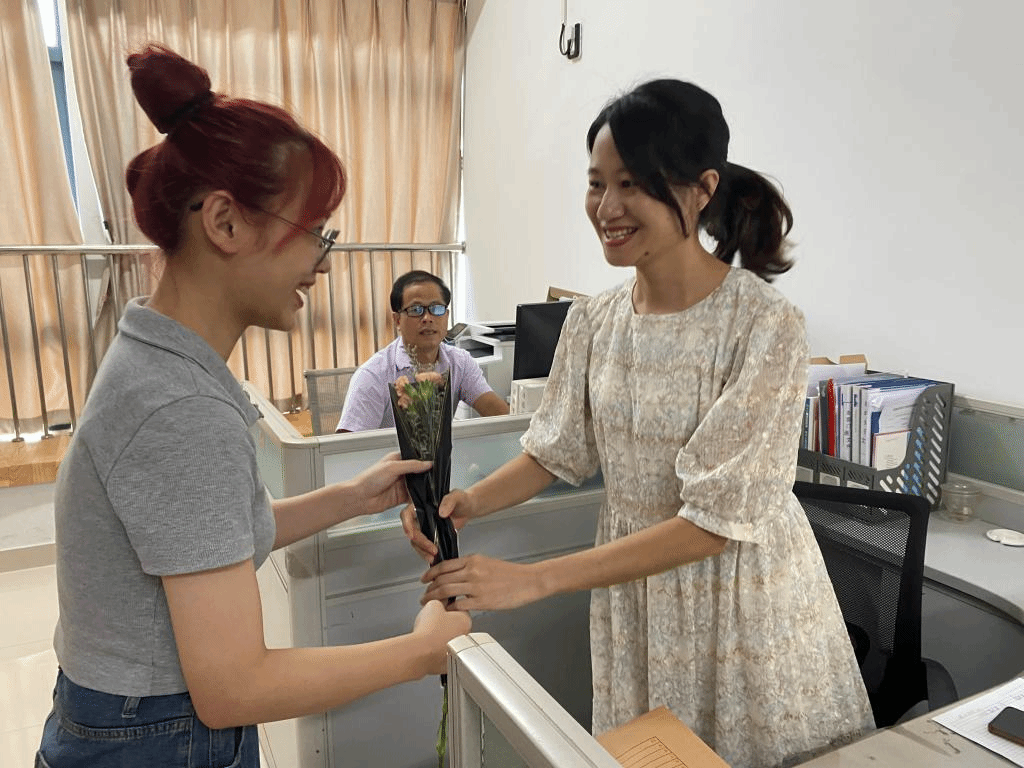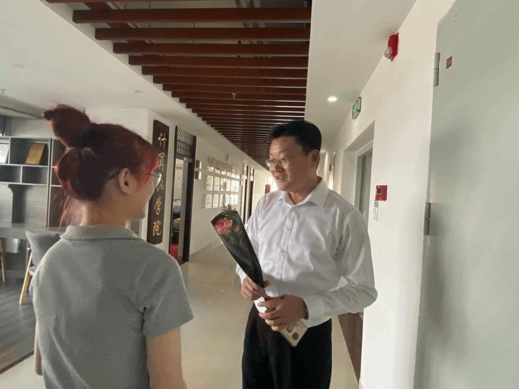 金秋九月,是一个满载收获的季节,也是一个充满感恩的季节。今年的教师节恰巧与传统的中秋节牵手相逢,给节日更添一抹喜庆的色彩。砺志楼213随着下课铃声的响起充满生机,学生代表心怀感恩、手捧鲜花,为孜孜不倦、幸福洋溢的老师们送上鲜花并进行交谈。