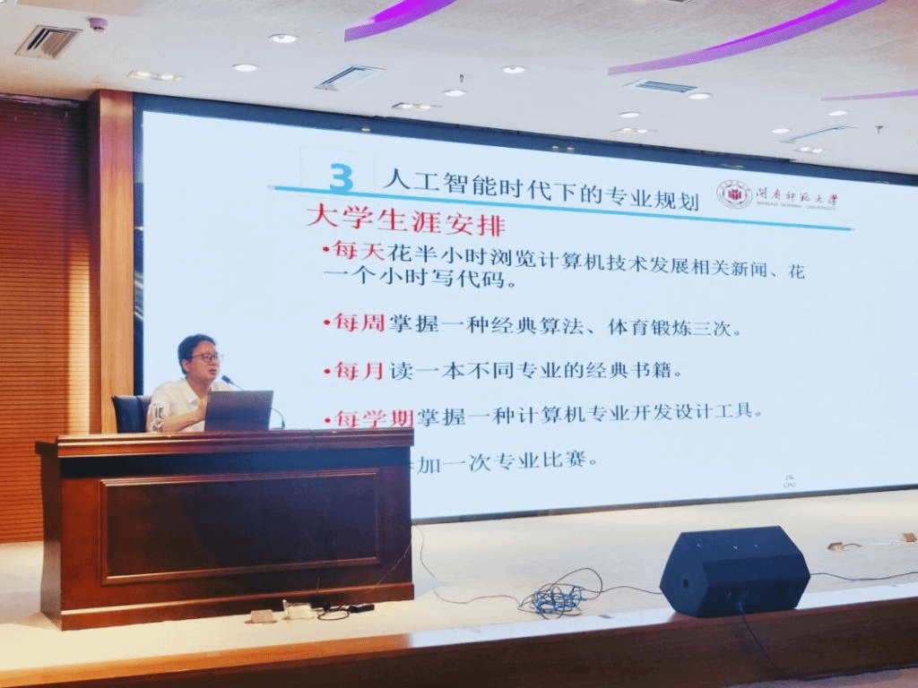 课堂上,林耀进院长围绕人工智能时代下的社会需求、隐私保护、专业规划三大方面,剖析人工智能时代下计算机专业人才应有的定位,期望同学们在大学里坚持学习,合理规划,鼓励同学们努力成为堪当强国重任的时代新人。