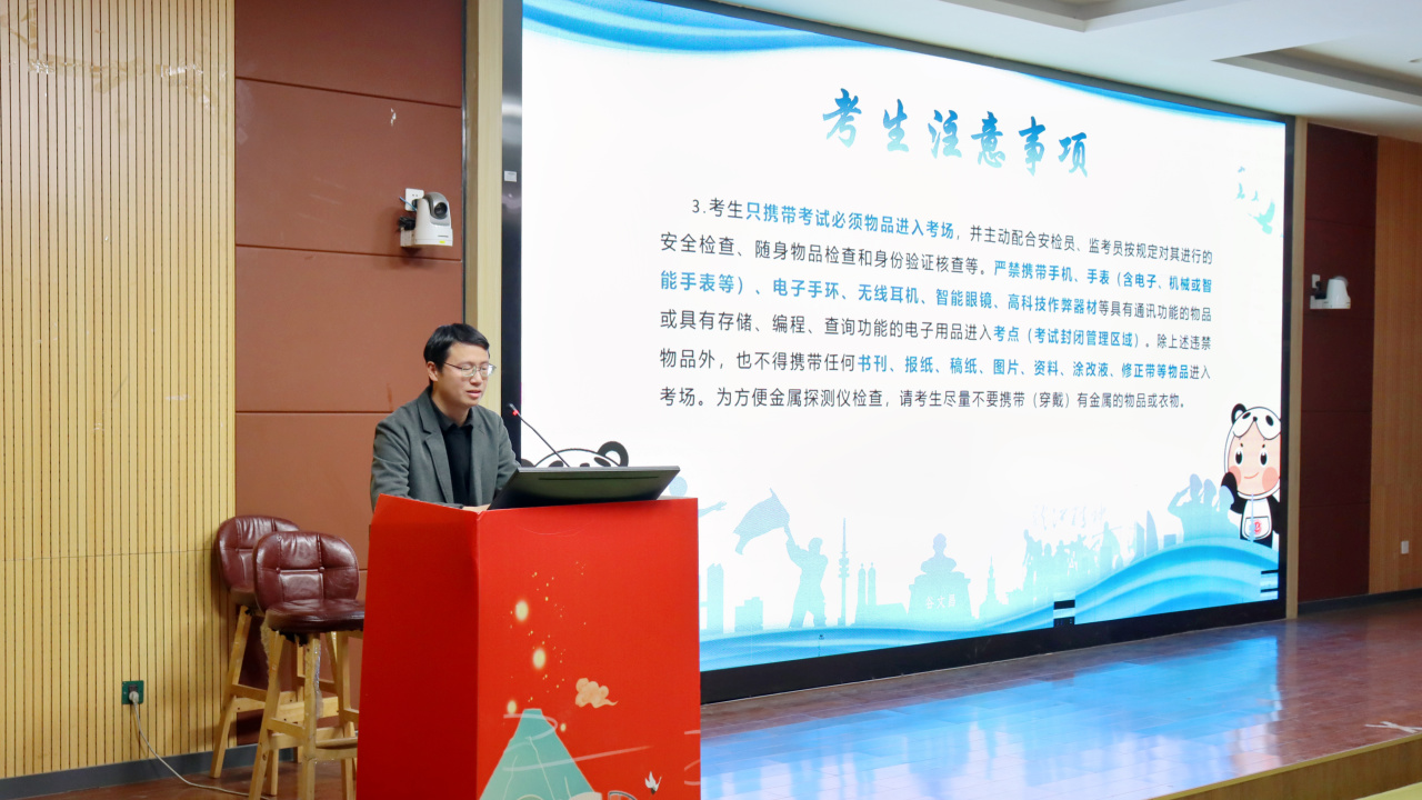 会上,辅导员张健老师详细说明了考试相关注意事项、进场要求和考场规则,强调了国家教育考试相关法律法规,叮嘱同学们注意考试时间,携带必备证件,自觉遵守考规考纪,坚决守住诚信考试的底线。