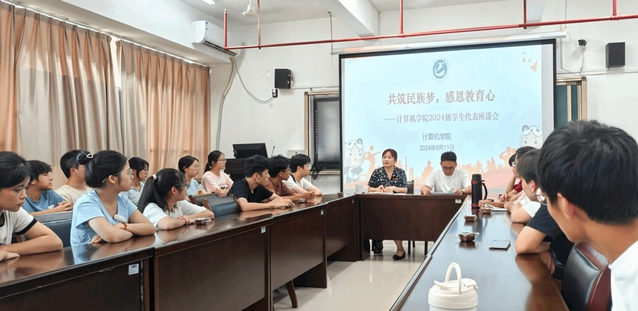 在科技楼北1106会议室举办主题为“共筑民族梦,感恩教育心”的学生代表座谈会。学院党委副书记陈小玲、辅导员郭荣宗、庄露璇和2024级各民族学生代表参加了座谈会。