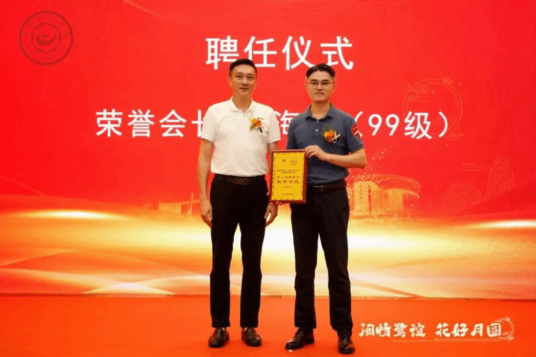 ▲母校校友会会长陈志宏为荣誉会长黄海良颁发聘书