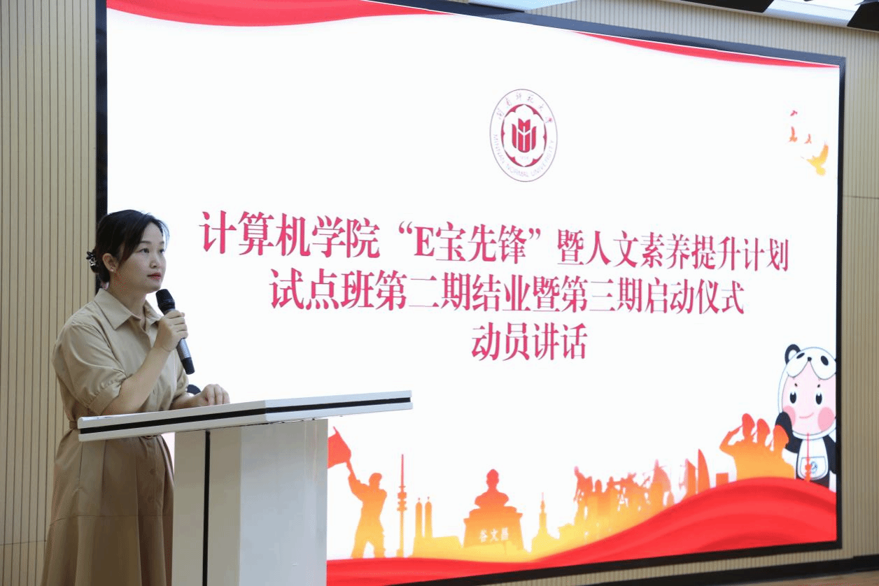 最后,学院党委副书记陈老师作动员讲话,并对全体学员提出了三点希望:一是保持“E宝先锋班”的特色,兼顾科技与人文,实现跨学科学习,既深耕计算机科学,又广泛涉猎人文社科,促进全面发展;二是明确身份和责任,扮演好学生和学生干部的双重角色,将学习作为信仰,锤炼品格,练就过硬本领,发挥模范带头作用;三是充分利用“E宝先锋班”平台,主动锻炼,勇于创新,追求卓越,不断提升和完善自我。