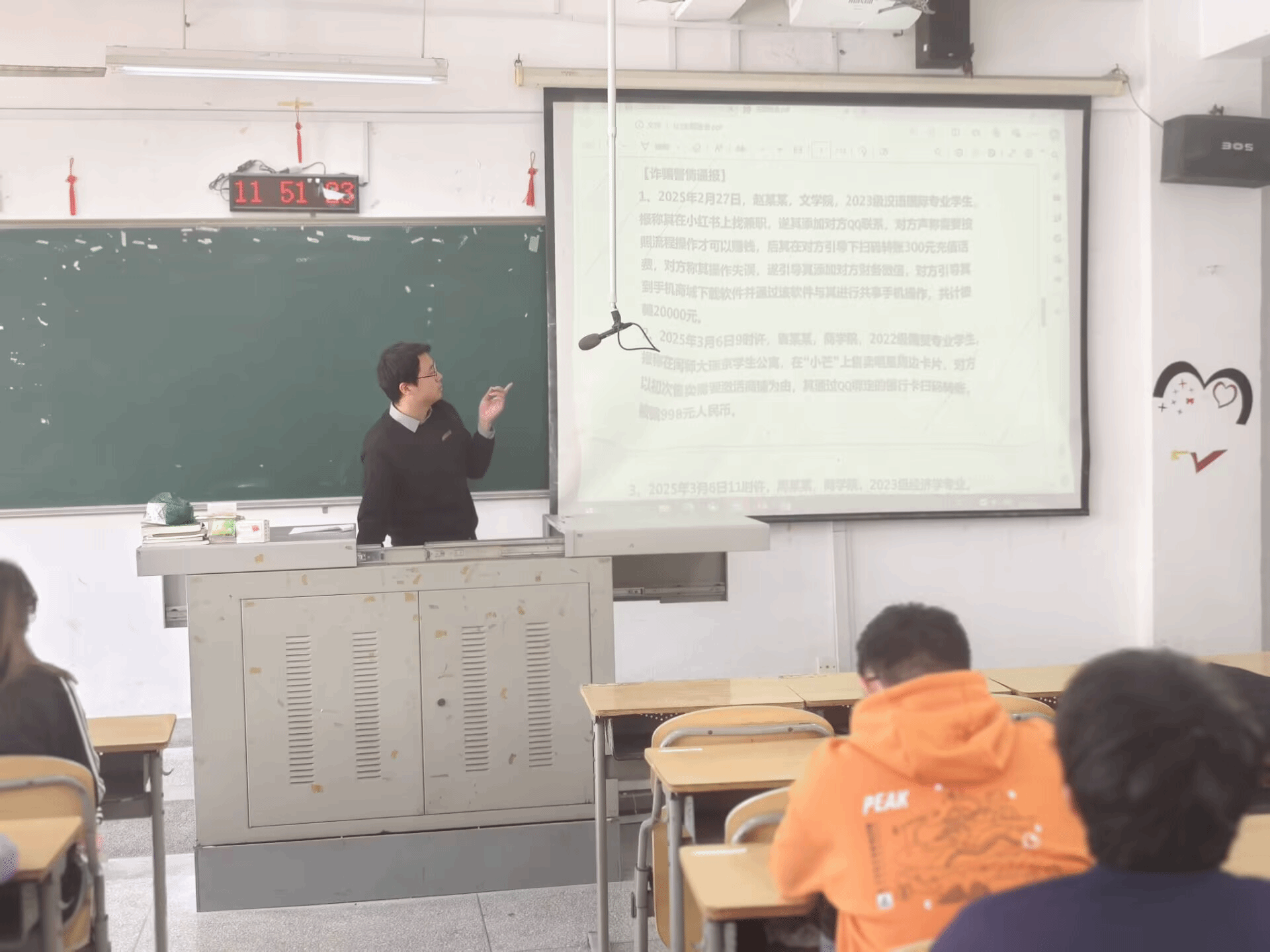 班会上,辅导员与班主任结合近期高发的诈骗案例,介绍“刷单返利”“虚假贷款”“冒充客服”等常见诈骗手段,提醒学生保护个人信息,对不明链接、陌生来电保持警惕,切勿轻信“高收益”“紧急转账”等话术。