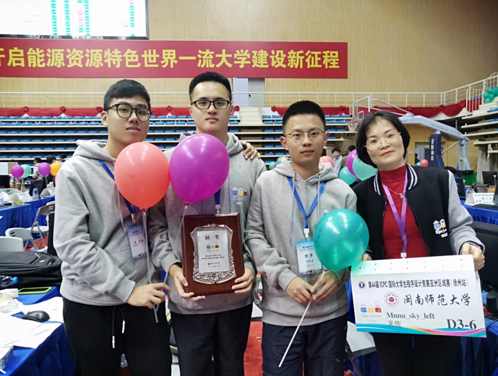 ACM教练何秋红老师带队,三位ACM队员罗文涛、傅书浩和林俊逸组成的“天佐”队参赛,比赛期间,闽南师大代表队与各大高校代表队展开激烈的角逐,在我校ACM队员们的齐心协力下,攻克了一道又一道的难题,最终获得ACM-ICPC亚洲区域赛徐州站铜奖。