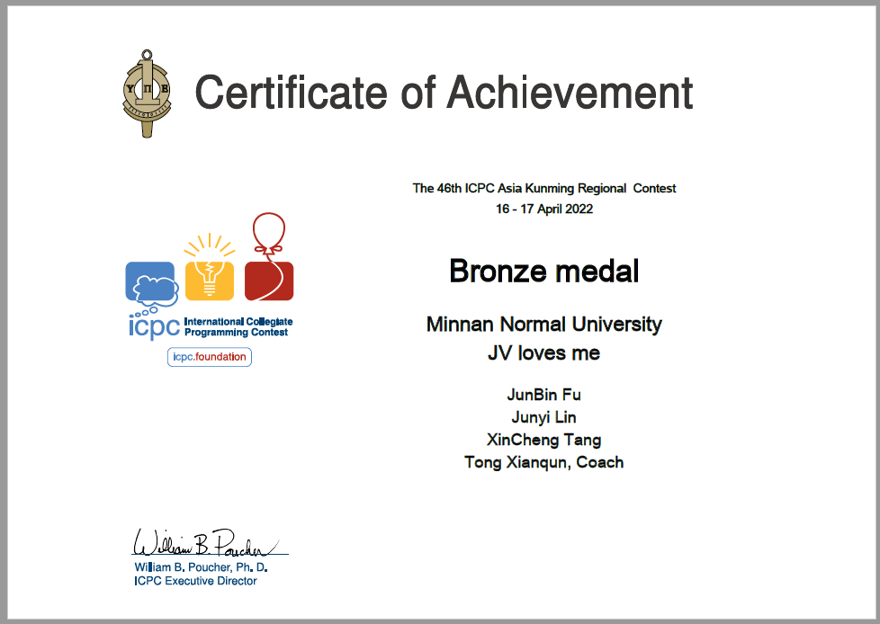ACM队员唐鑫程、林俊逸、傅俊斌,3名同学组成的队伍在比赛中发挥出色,获得铜奖。