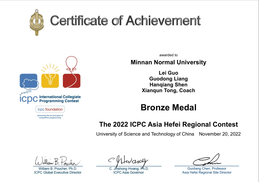 ACM队员沈汉强、梁国栋、郭雷,3名同学组成的队伍在比赛中再获铜奖。
