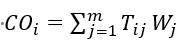 该门课程第i个课程目标的达成度(COi),根据课程教学大纲所规定的考核评价方式(课堂表现、作业实验、期末考试等)进行计算,即各考核项的得分值的加权求和,如公式4-1所示。