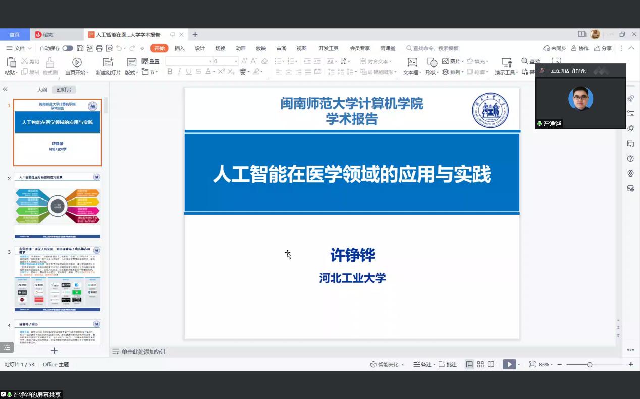 师生作题为“人工智能在医疗领域的应用与实践”的学术报告。本次报告会采用腾讯会议线上的方式进行,毛煜博士主持了本次报告会。