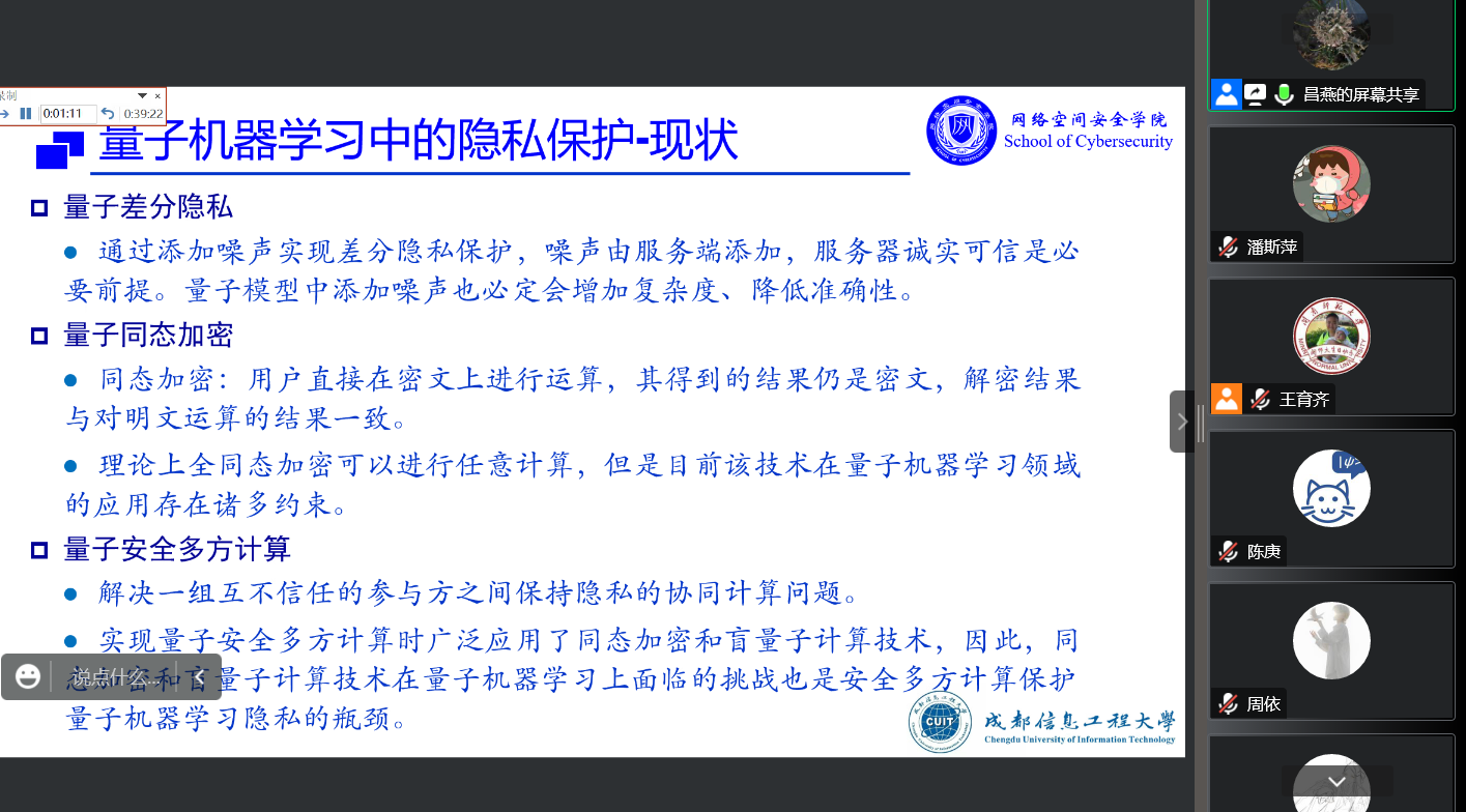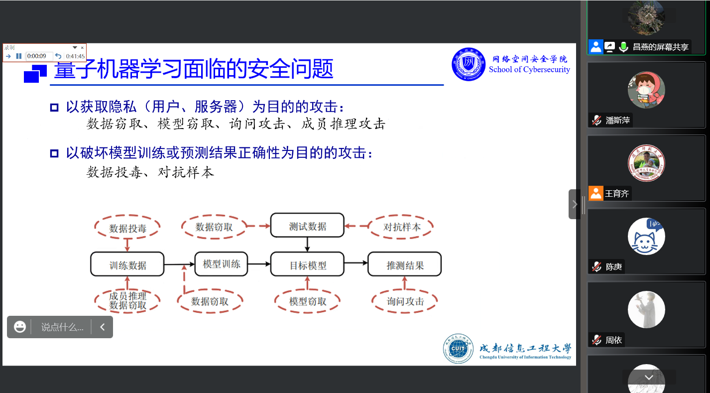 师生做线上专题报告,报告题目为“量子机器学习中的安全问题”。本次报告由学院王育齐副教授主持。