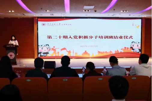 举行第二十期入党积极分子培训班结业仪式。学院党委书记祁超,院党委副书记陈小玲,院团委副书记黄明芳,各学生党支部书记出席结业式。结业仪式由入党积极分子培训2班班主任谢映菁主持。