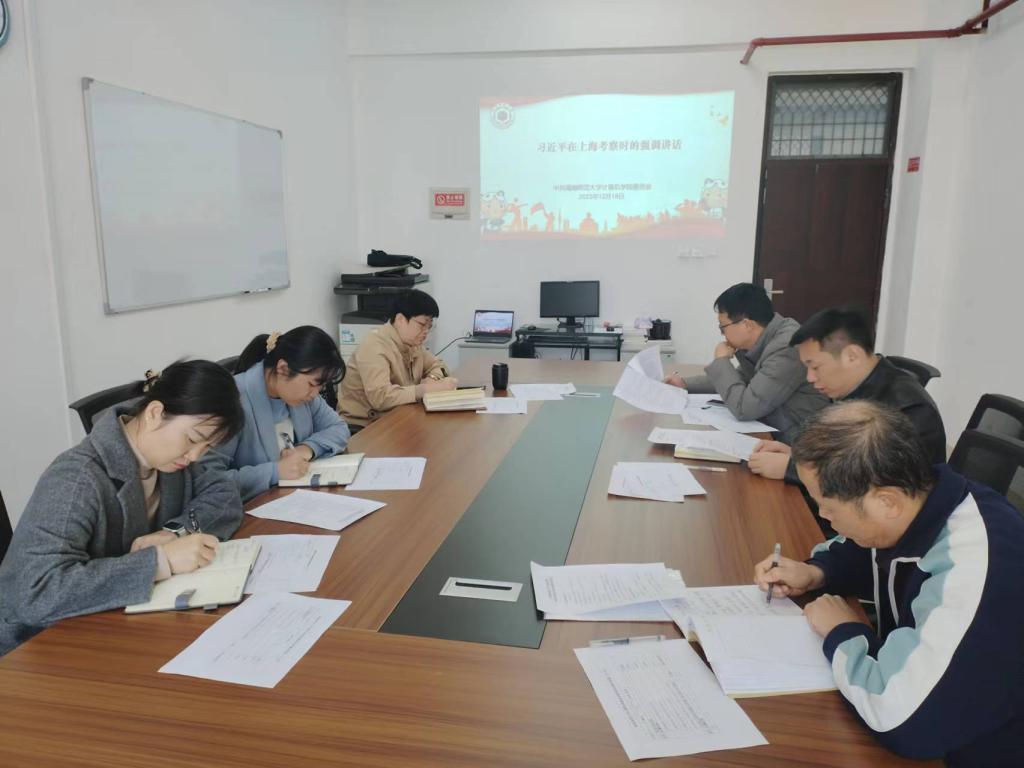 党委理论学习中心组学习会在科技信息楼北1109会议室举行。全体学院党委班子成员参加会议,学院党委书记祁超领学“习近平给武汉大学参加中国南北极科学考察队师生代表的回信精神、习近平向2023年‘读懂中国’国际会议(广州)致贺信、习近平向首届‘良渚论坛’致贺信、习近平向‘2023从都国际论坛’致贺信、习近平在第十个国家宪法日之际作出重要指示强调以及习近平在上海考察时的强调讲话”等专题,并作重点发言。学习会由祁超主持。