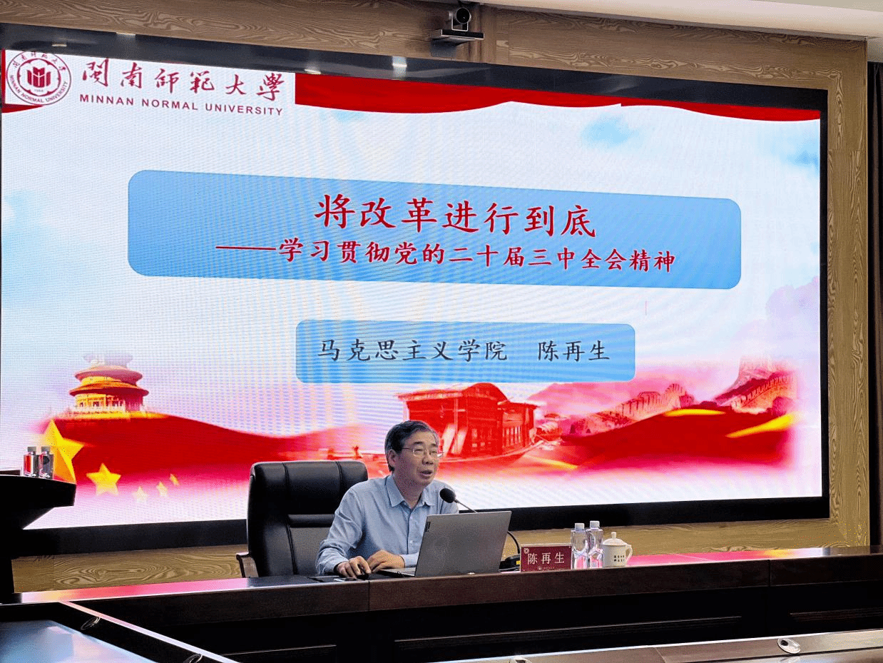 马克思主义学院院长陈再生教授应邀作题为《将改革进行到底——学习贯彻党的二十届三中全会精神》的专题辅导报告。陈再生教授从“改革”的三中全会及其重要地位、“改革”是党的二十届三中全会的红线、以改革状态贯彻落实三中全会精神三个方面深入解读了党的二十届三中全会精神。