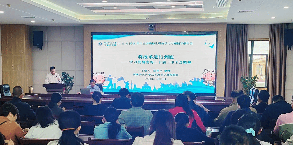 在科技信息楼1607会议室举办人文大课堂第十五讲暨师生理论学习专题辅导报告会,专题学习宣讲党的二十届三中全会精神。学院全体教职工、学生正式党员参加报告会,报告会由学院党委书记祁超主持。