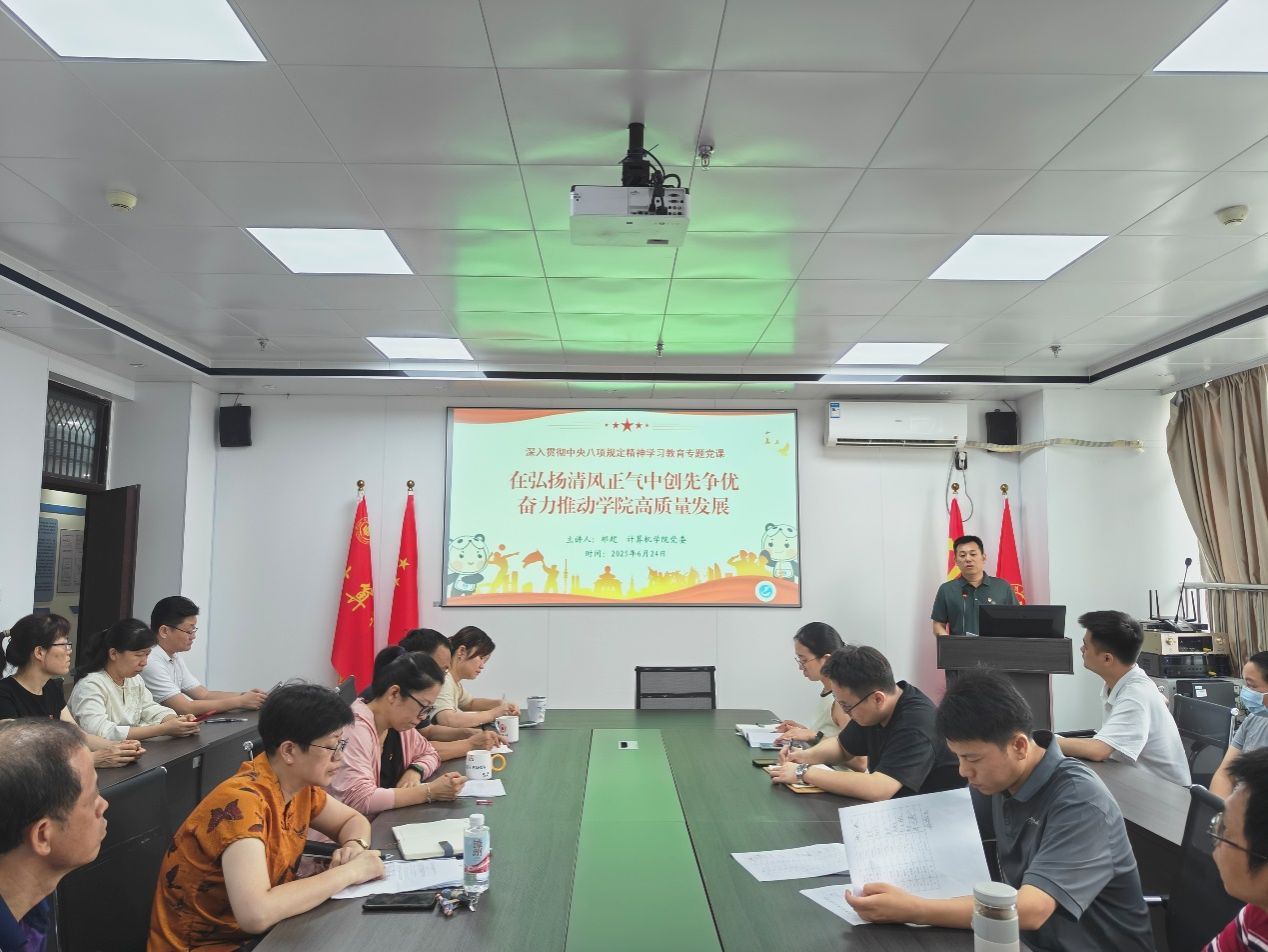 党委书记祁超以“在弘扬清风正气中创先争优 奋力推动学院高质量发展”为主题面向所联系党支部计算机科学与技术党支部党员讲授专题党课。他详细解读中央八项规定精神核心要义和具体内容,从历史与现实维度剖析学习教育重要意义。他强调,作风问题本质是党性问题,驰而不息推进作风建设是学院发展的坚实保障。全体党员干部要聚焦强化意识作风筑牢“根基工程”、提升能力素养打造“动力引擎”、健全制度机制构建“长效保障”,将服务师生、提质增效、干事创业要求具象化到立德树人各项工作中。