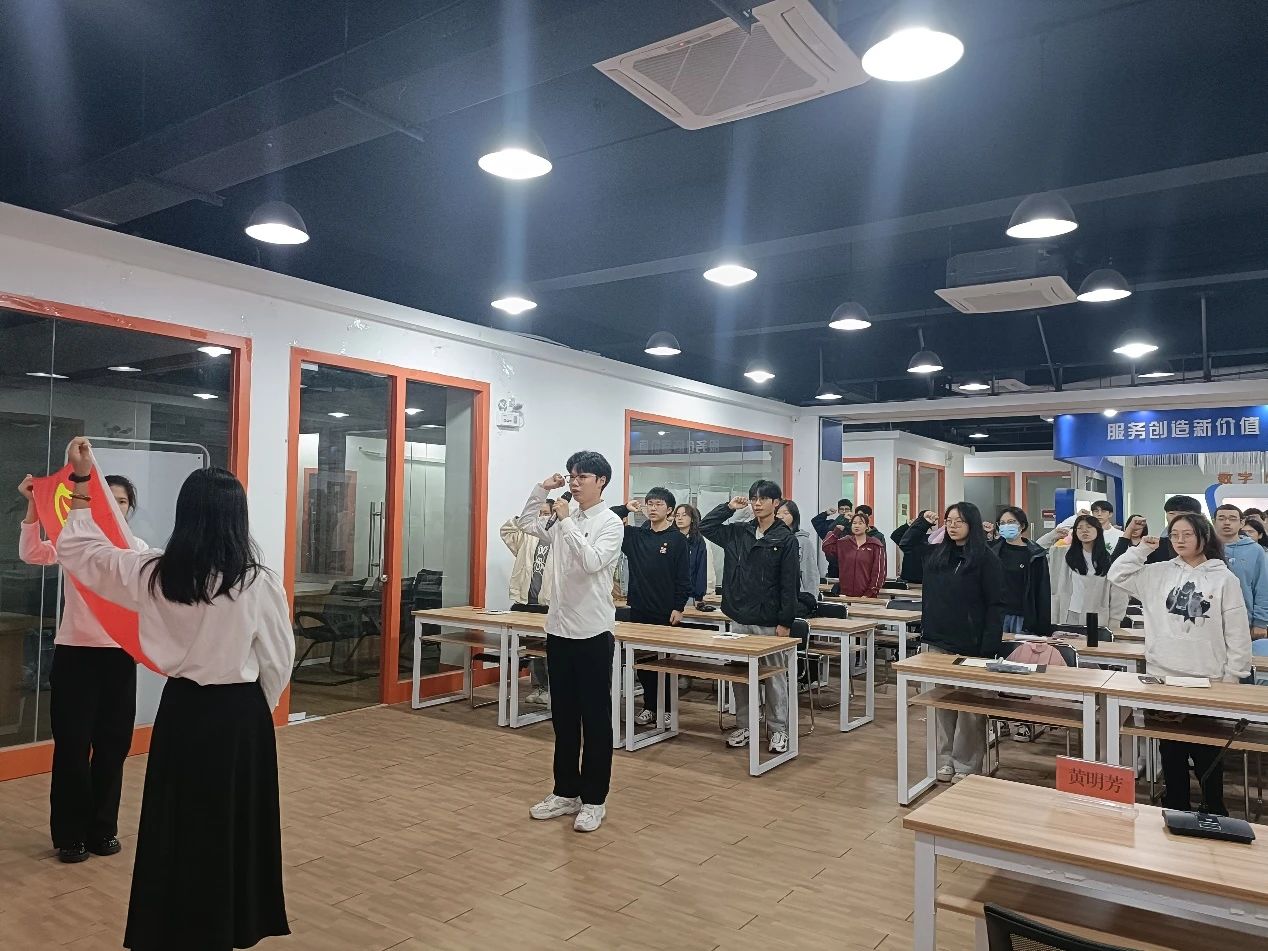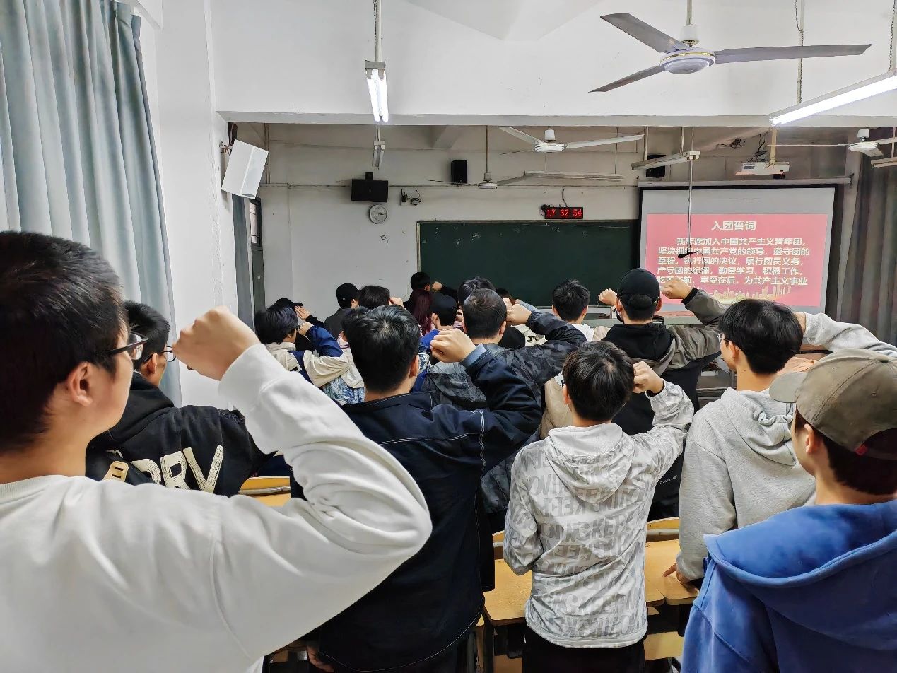 会议第五项议程,重温入团誓词。团支部所有成员在团旗下庄严宣誓,再次将团员的初心和使命铭记心中。