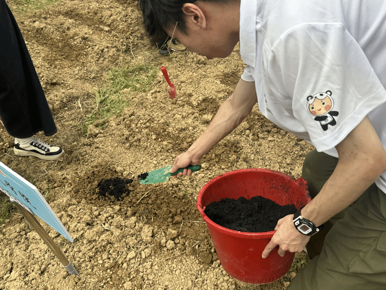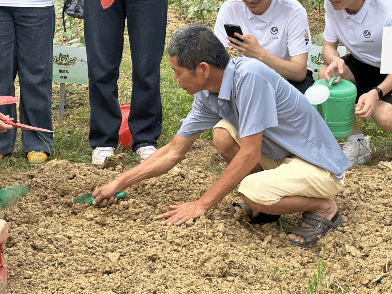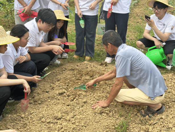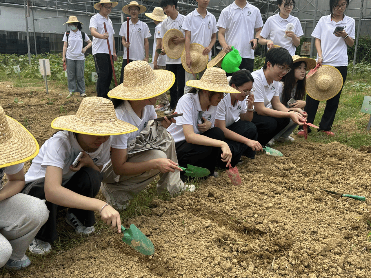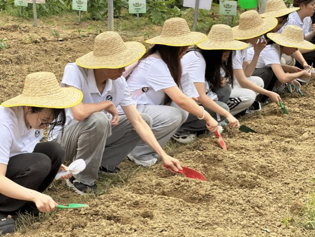 学员们头戴草帽,手持农具,俯身于土地,播种、浇水、撒草木灰。