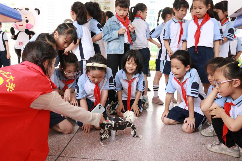 的大学生们向中小学生展示智能车、机器狗等科技设备。